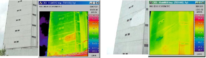 图2:某医院大楼存在严重的空股,左图为维修前红外图像;图右为维修后红外热像仪拍摄的图像