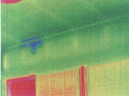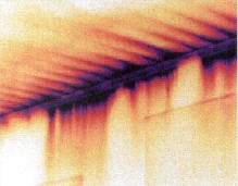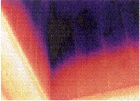 图4:红外检测清楚的显示楼房能量损失程度。楼龄为8年,红外图象显示在墙体和房顶都有明显的热损失,基础处也没有隔热处理。对楼顶进行检测发现天花板没有安装隔热材料。房屋主人知道了热损失程度,也确切理解了该采取措施进行改进。修补后可再用红外检测评估隔热安装的效果和质量。